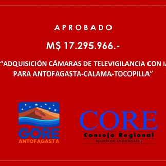 En forma unánime el Consejo Regional de Antofagasta aprobó recomendación realizada por la Comisión de Seguridad al proyecto presentado por la Delegación Presidencial Regional por más de 17.566 millones de pesos para la implementación de moderno sistema de cámaras de televigilancia y la instalación de portales lectores de patente con IA, en los puntos más críticos de la región, comenzando con Antofagasta, Calama y Tocopilla.